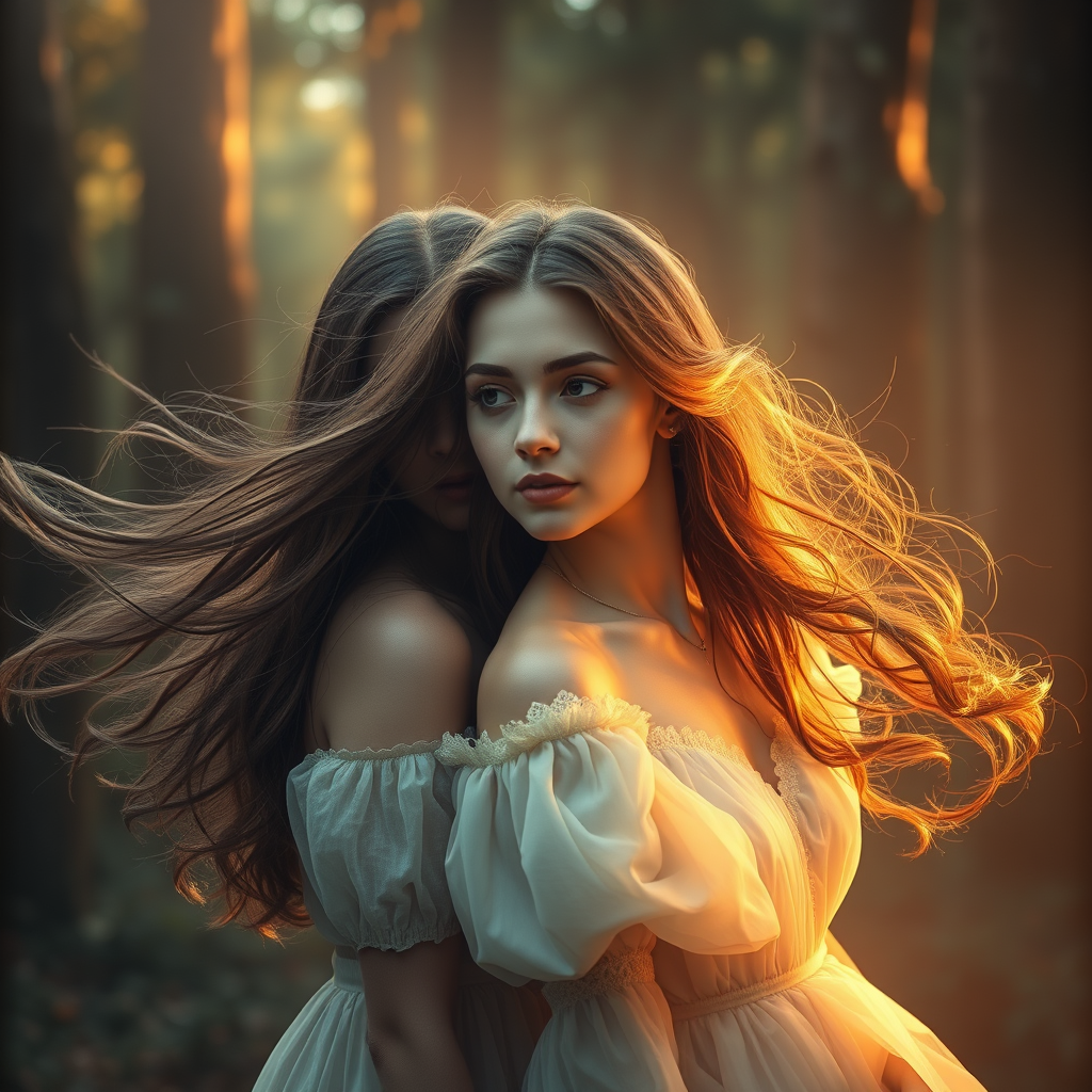 Enchanted and serene forest, young women with flowing, realistic hair, full body and balanced proportions, adorned in vintage dresses, bathed in mystical light with a radiant aura glow, cinematic and dramatic composition, ethereal and heavenly ambience, divine and celestial presence, echoing the style of Elly May, a touch of melancholy, captured in ultra-high definition with exquisite details and vibrant HDR, reminiscent of 8k imagery, embodying a sense of wonder and tranquility.