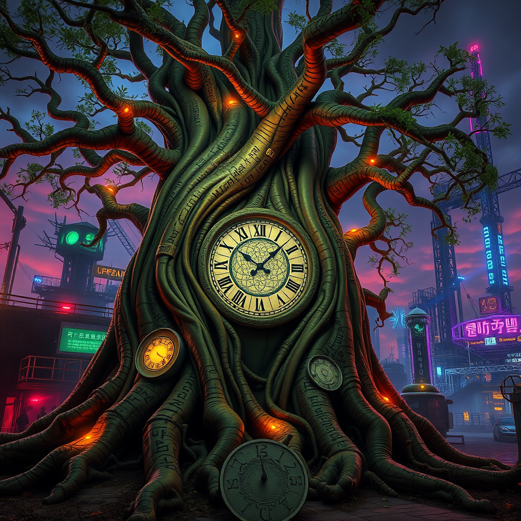 Enchanted dragon tree roots encasing an ancient clock covered in mystical runes, glowing softly with bioluminescent hues amidst a cyberpunk backdrop, vibrant neon lights reflecting off metallic structures under a moody twilight sky.