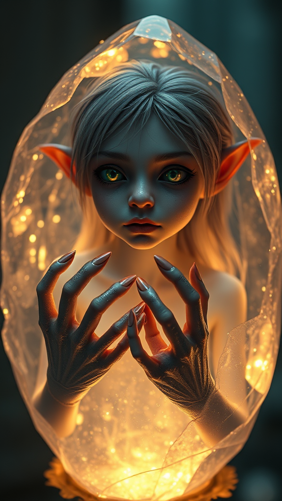 Enchanted elf encased in a glowing crystal, featuring sharp focus and ethereal volumetric lighting. Captivating, elegant, and highly detailed rendering, inspired by midjourney art style. Evocative of a trending Artstation masterpiece or award-winning photograph, presented in stunning 8k UHD HDR quality. Mysterious aura with an intriguing duplicate effect, hinting at mutation and cloning. Slightly distorted features with a cross-eyed gaze and elongated neck, accentuated by extra fingers and mutated hands. Surreal and captivating scene, skillfully avoiding low resolution, out of frame distractions, blurriness, or digital imperfections. Emphasizes the mystical and otherworldly without overt cartoonish elements or unnecessary graphical interferences.