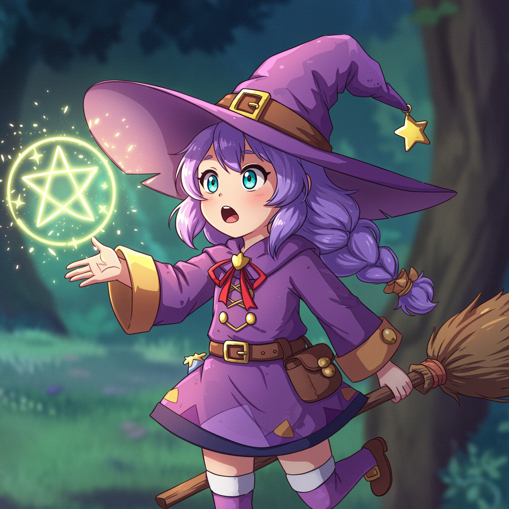 Enchanted Little Witch casting a magical spell, Adorable Face, Astonished expression, Vibrant Niji Mode, charming attire, sparkling aura, captivating eyes, colorful scene, whimsical atmosphere, ethereal light, playful energy, enchanting surroundings, vivid hues, mystical environment, delightful surprise, joyful wonderment.