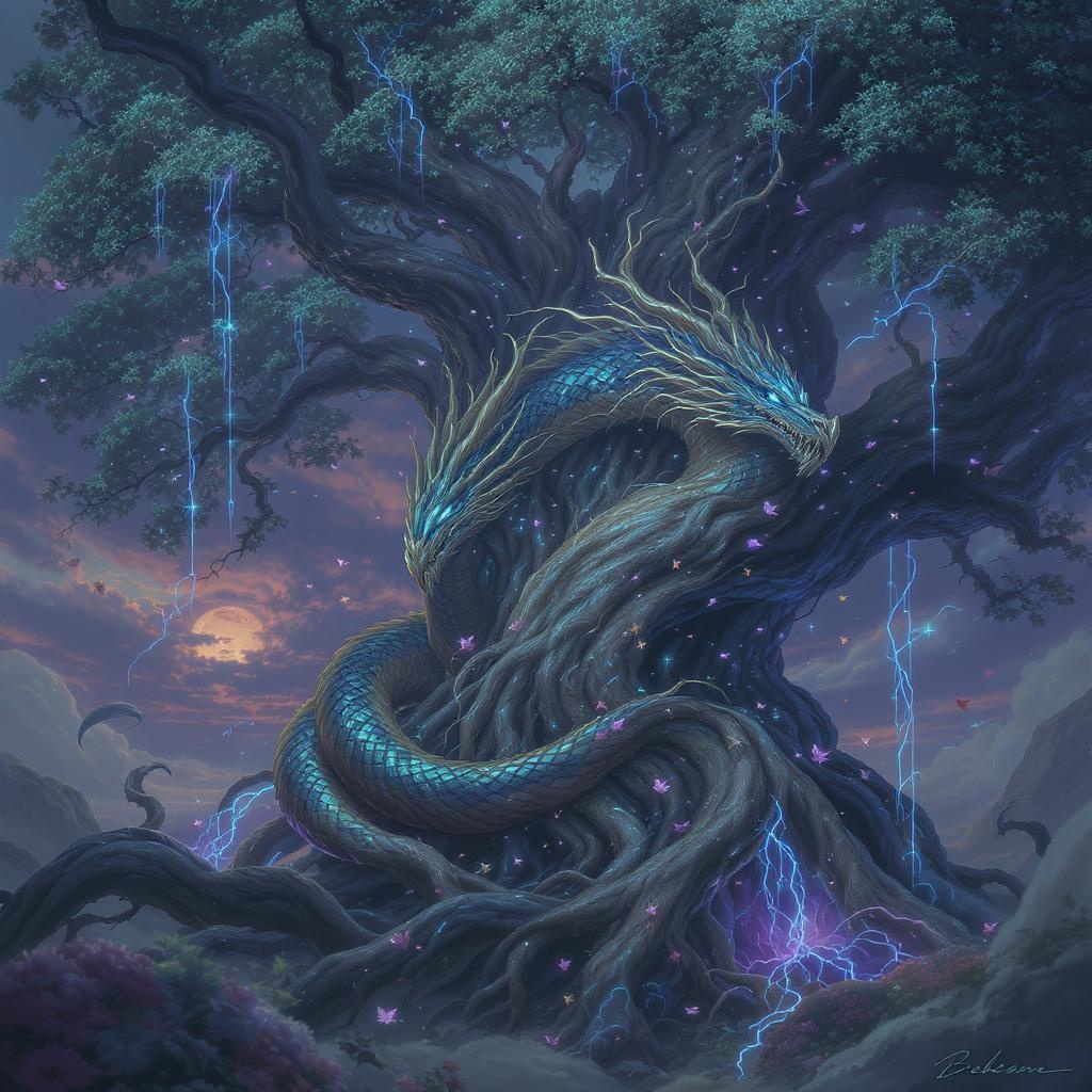 Enchanted roots of an ancient, mystical tree entwine around a mighty chrono dragon, their tendrils shimmering with ethereal light, capturing the creature in a timeless embrace. The dragon's scales glisten in hues of iridescent sapphire and emerald, contrasting the dark, gnarled bark of the roots. Time seems to slow within this enchanted snare, where delicate leaves flutter with a whisper of magic. In the background, a twilight sky casts a dreamy glow, illuminating the scene with soft, otherworldly hues. The air is filled with the sound of rustling leaves and the distant echo of time's passage, creating an atmosphere of serene, captivating enchantment.