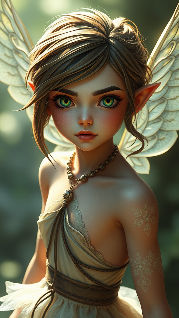 Enchanted sprite, athletic build, gazing directly at the observer with a captivating intensity.