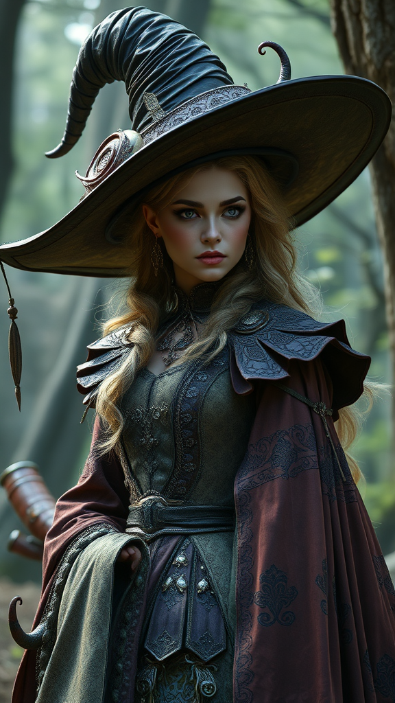 Enchanted wilderness sorceress dressed in an ornate and mystical academy attire, adorned with an oversized, gracefully curved witch's hat, immersive, intricately detailed, graceful, exquisite, visual symphony, digital rendering, visionary concept art, showcasing on leading art platforms, capturing the essence of nature and magic.