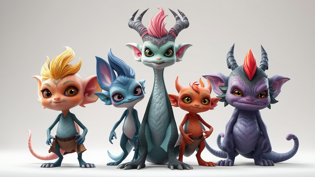 Enchanting character creation: Fantastical beings, imaginative, vibrant expressions, intricate details, vivid color palette, distinctive anatomy, premium digital artwork, 3D visualization, artistic flair, one-of-a-kind, critically acclaimed, Adobe Photoshop, Blender, V-Ray, spirited, magical, plain backdrop, minimalist, abstracted elements.