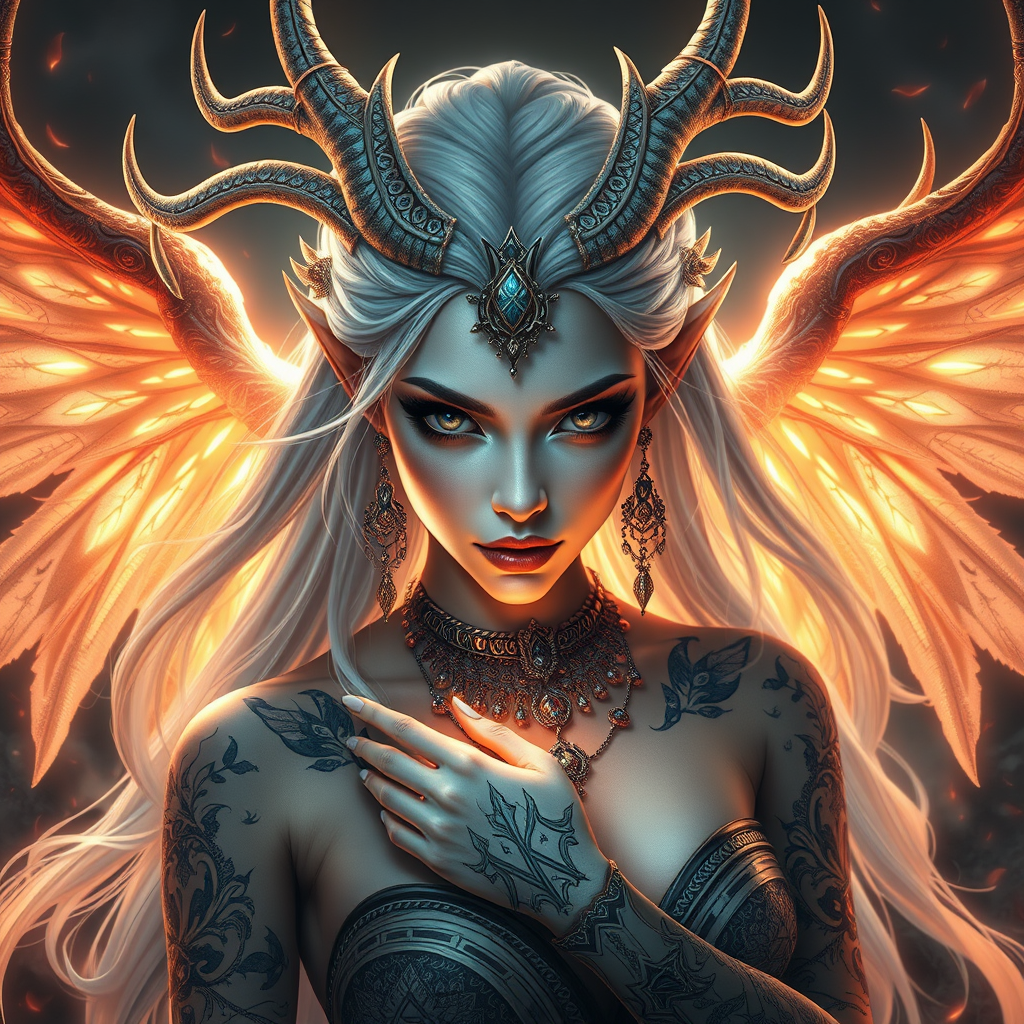 Enchanting figure, serene beauty, ethereal allure, captivating, Divine presence, delicate antlers, radiant aura, silvery hair, porcelain skin, intense, fierce, mystical demoness, intricate tattoos, ornate decorations, elegant jewelry, high-definition clarity, luminous glow, hypnotic gaze, intricate eyes, dynamic composition, fiery embers, drifting foliage, end-of-world theme, artistic illustration, sophisticated, photographic realism, striking pose, volumetric lighting, mystical essence, game character design, lifelike detail, breathtaking backdrop, ancient ruins, artistic inspiration, influences of Sophie Anderson and Artgerm, conceptual portrait, distinctive character, striking and memorable.