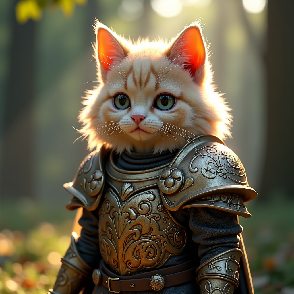 Enchanting fluffy feline knight adorned in intricately detailed gleaming armor, photorealistically rendered in 4K resolution with a focus on ultra-fine details; utilizes advanced V-Ray rendering and Unreal Engine for a captivating visual experience. The scene subtly integrates a mystical forest backdrop, casting gentle dappled light across the warrior's fur to enhance the enchantment, while maintaining the whimsical charm and fierce valor of the original concept.