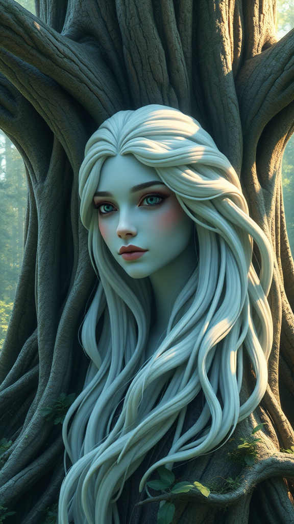 Enchanting forest deity with ethereal long hair and radiant pale skin, gracefully surrounded by the ancient majesty of a colossal tree, crafted by MountainDog Studios. Her face is intricately detailed, embodying exquisite character design, presented in a model sheet and clip art style. The scene is a mesmerizing blend of 3D render and digital artistry, enhanced by the power of Unreal Engine. With visual effects and cinematic lighting, it adopts an isometric perspective, seamlessly merging low-poly aesthetics and Blender craftsmanship. Ultra-realistic, in 8k resolution, this photo-realistic portrayal is both a captivating cinematic experience and a testament to creative imagination.