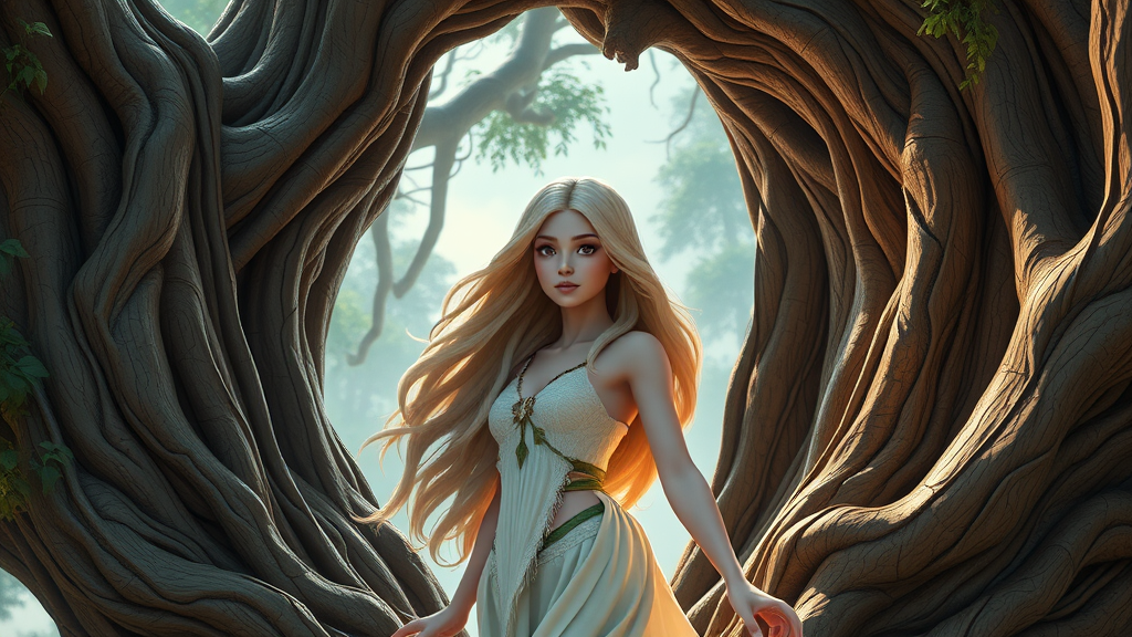 Enchanting forest goddess with flowing locks and alabaster skin, poised within a colossal, age-old tree setting, by MountainDog Studios; intricate facial details; character concept; model sheet; clip art aesthetic; 3D rendering; digital 3D creation; Unreal engine visuals; cinematic lighting; isometric view; low-poly style; Blender-crafted; ultra-realistic; 8k resolution; photorealistic; cinematic flair; --ar 2:3 --s 1000 --chaos 100 --q 2.