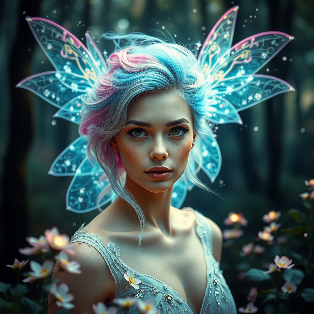 Enchanting forest landscape, time-bending sorcerer with flawless complexion, ethereal light particles, iridescent fairy wings, vibrant neon hair, delicate fractals of energy, immersive depth, spirit of adventure, abundant blossoms, artistic elegance, impeccable form, ultra-high-definition 32k resolution, premium quality, high-resolution, lifelike imagery, expert composition, cinematic perspective, dynamic lighting, rich hues, intricate detail, full body from a distance, engaging the viewer, mid-range shot.