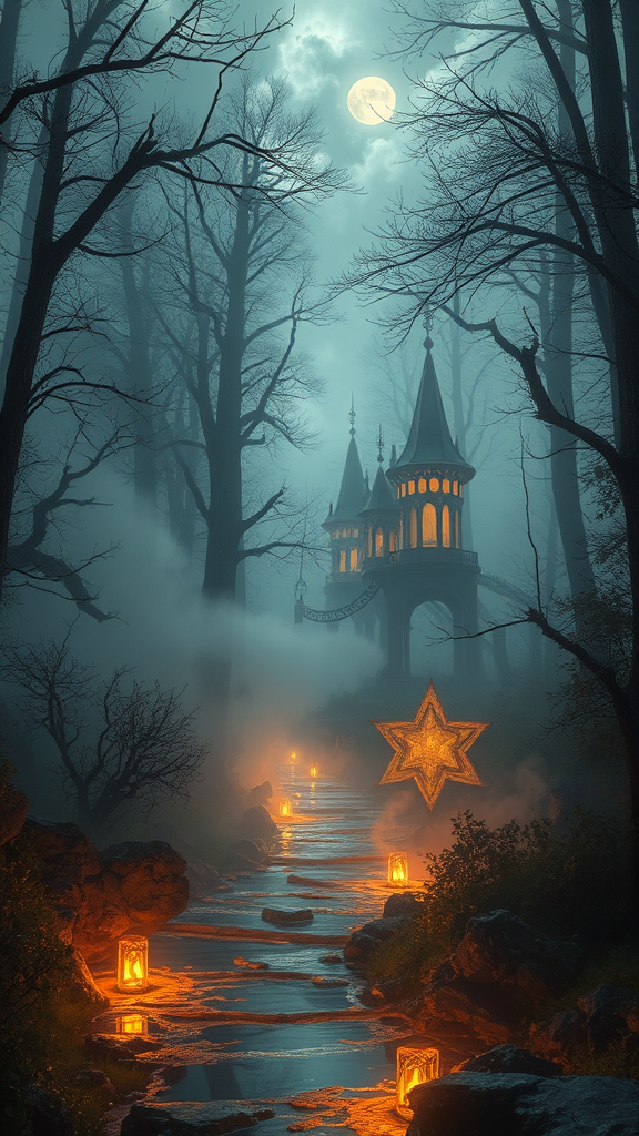 Enchanting forest shrouded in mist, mystical witches amidst high-contrast lighting, surreal photo capturing ethereal glow, abstract deformations in intricate sketches, reflections on water blend with industrial elements, gleaming gold and shimmering crystals form exquisite jewelry and gems, mystic and fantastical atmosphere akin to a cyberpunk and steampunk fusion, detailed concept art reminiscent of 'Alice in Wonderland', turbulent clouds loom with a storm's energy, juxtaposition of modern and ancient architectural marvels, crafted from ivory and marble, evoking a paradisiacal vista, mind-bending visual experience in 4K resolution, a masterpiece of organic forms entwined with rusted textures, elevated by HDR imagery, brought to life through octane render.
