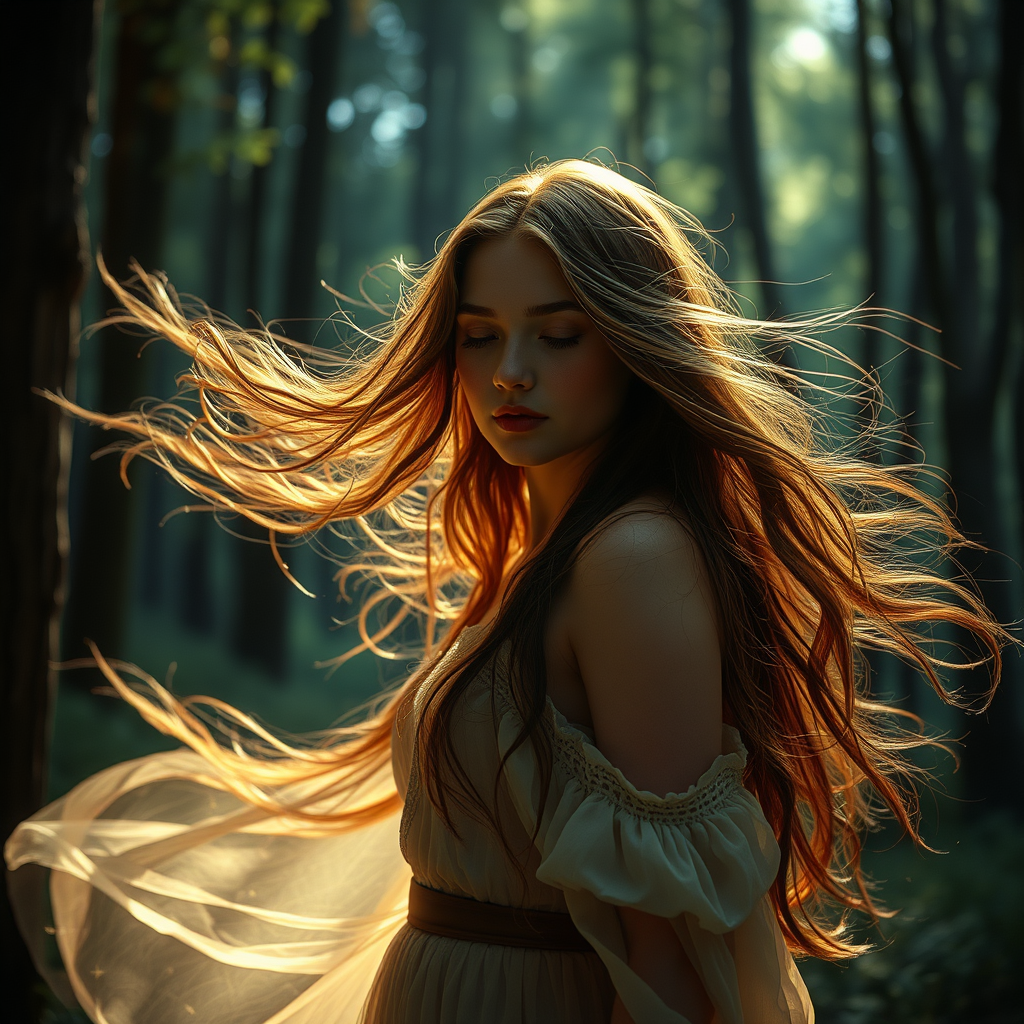 Enchanting forest, young women realistic, flowing long hair, full body depiction, harmonious proportions, vintage attire, mystical illumination, ethereal glow, radiant aura, cinematic framing, dramatic yet serene, otherworldly, cinematic lighting, heavenly ambiance, divine essence, celestial atmosphere, reminiscent of Elly May's style, wistful undertones, exceptionally detailed, ultra high definition, vivid hdr, 8k resolution, intricate nuances.