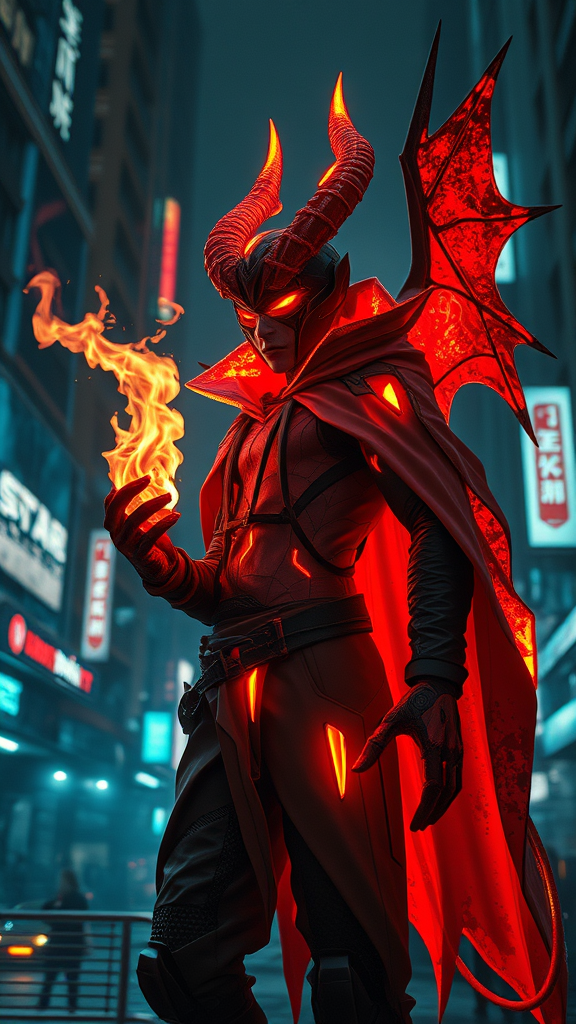 Enchanting Inferno Demon with Fiery Cape, impeccably balanced, set in a Cyberpunk Edgerunner universe, late-night ambiance, exhaling flames amidst cold chaos and sharp contrasts, seen from afar, captured in stunning 8K resolution - a shimmering, delicate composition inspired by loish and Jeremy Mann. A full-body shot that highlights the character's unique features amidst a neon-lit urban landscape, adorned in cyberpunk streetwear that glows with neon accents. The setting teems with futuristic energy, featuring sharp cityscapes and electric atmospheres. A seamless blend of 3D CG artistry encapsulating the dynamic essence of cyberpunk aesthetics with a focus on impeccable details and proportions.