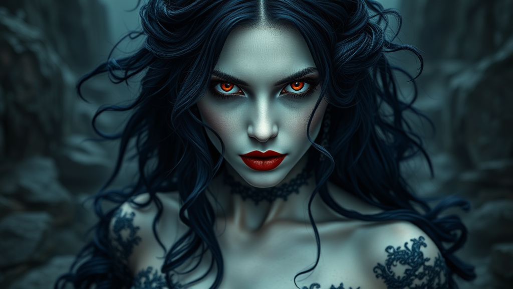 Enchanting pale-skinned woman with deep indigo hair and striking crimson eyes, embodying the allure of a seductive queen vampiress. She exudes a dark, morbid, gothic charm, surrounded by a wet, dense, and atmospheric setting that feels epic and dramatic. Her presence is both creepy and ornate, capturing the essence of a femme fatale in a glamorous and passionate way. The scene is imbued with incredible detail and realism, featuring an expansive landscape with intricate textures and a full-body perspective. The photorealistic rendering is enhanced by volumetric lighting, adding depth and intensity to the overall image.