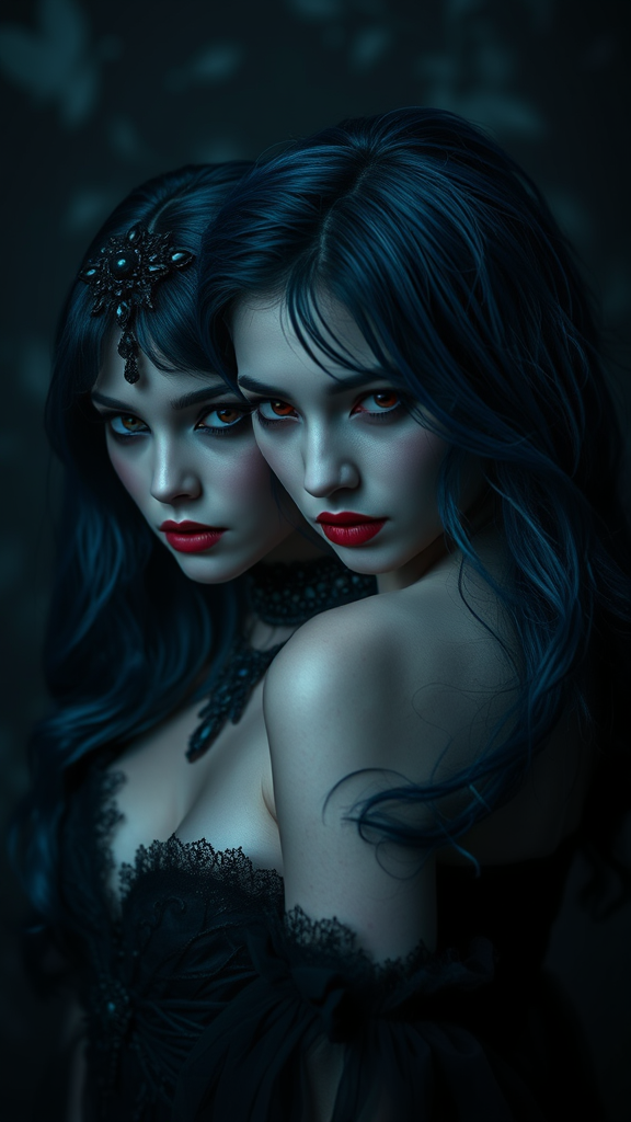 Enchanting pale-skinned women with midnight blue hair and captivating crimson eyes, embodying an irresistible allure as regal vampiresses. Their charm is both dark and mysterious, exuding a gothic, morbid beauty amidst a dense and atmospheric setting. The scene is wet, with a dramatic tension that draws you in, enhanced by ornate details and a subtle creepiness. These femme fatales are captured in a glamour shot, their passion and intensity palpable, rendered with incredible detail and photorealism. The landscape is richly detailed, with volumetric lighting adding depth to the full body shot, resembling an epic and cinematic masterpiece.