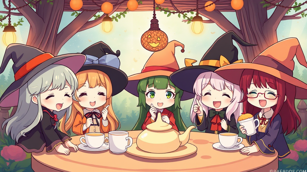 Enchanting scene, delightful chibi characters, whimsical witch tea gathering, adorable smiles, joyful atmosphere, lively colors, bright and cheerful essence