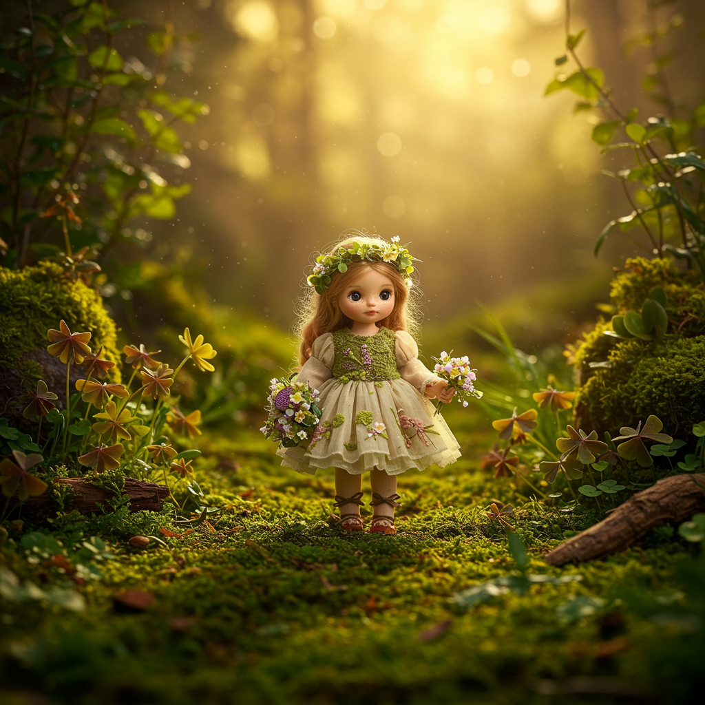 Enchanting scene featuring a figure in an adorable gown surrounded by lush moss, blooming flowers, and vibrant clovers under a warm, golden sunlight. The atmosphere is dreamlike and ethereal, with intricate details and sharp focus that bring the scene to life. The image is professionally color graded, presented as a masterpiece of art, and is trending on ArtStation in stunning HDR 4K and 8K resolution, with an impressive depth of field at f/1.8. The vivid high contrast and artful composition showcase a harmonious blend of nature and fashion, capturing a sense of whimsy and wonder. The scene is beautifully crafted, ensuring a captivating and immersive experience without any flaws or distractions.