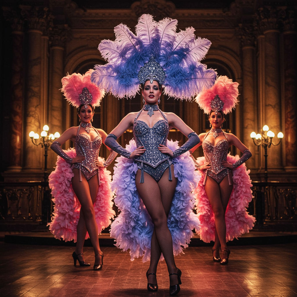Enchanting sirens, cancan dancers embodying vaudeville burlesque style, grace the stage adorned with exquisite feathers and captivating eyes against a backdrop of lavish architecture. Unbelievably stunning, with an atmosphere enhanced by RTX realism, they shimmer with bright luster in luxurious style. Captured in a cinematic full-body shot, photographed with precision using Canon and Hasselblad, the scene is breathtakingly detailed. The magic of m! shć, llll larpen, and unparalleled professional photographic lighting is evident, utilizing 50mm and 80mm lenses. A testament to the art of nḿhotography and reminiscent of Unsplash's finest.