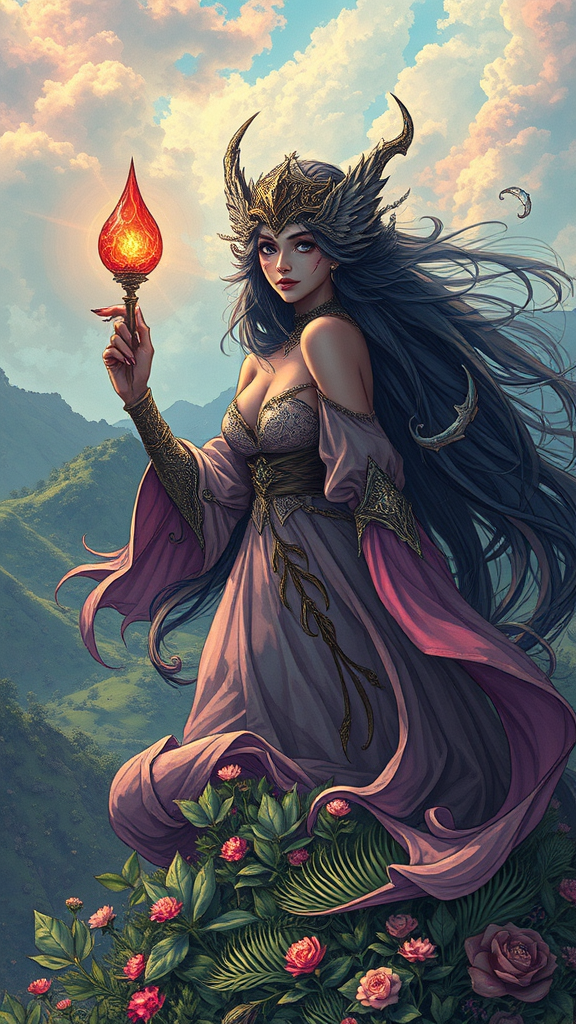 Enchanting sorceress| poised atop a lush hillside| centrally framed| exquisite, anime-inspired visage| artistic key visual| elaborate and stunning intricacies| astonishing detail| vivid and brilliant| sweeping and grand| theatrical composition| reminiscent of Carne Griffiths and Conrad Roset artistry.