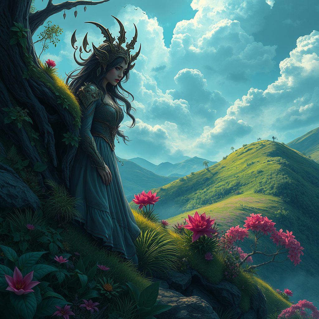 Enchanting sorceress | solitary figure on a lush hillside | focal point | exquisite and captivating visage | anime-inspired aesthetic | striking key visual | elaborate and intricate features | astonishingly detailed | stunning | vivid and colorful | wide-angle perspective | cinematic essence | reminiscent of Carne Griffiths and Conrad Roset artwork.