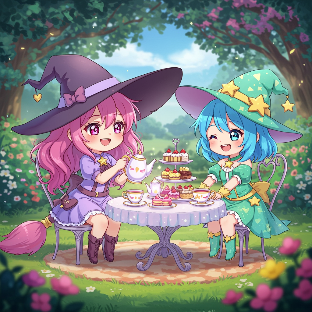 View this AI-generated image featuring enchanting top tier adorable chibi witches having a joyful tea party brimming with playful energy and a burst of vivid colors. Created using advanced AI technology, this image showcases creative visuals, AI artwork. Perfect for creative projects, digital art, i
