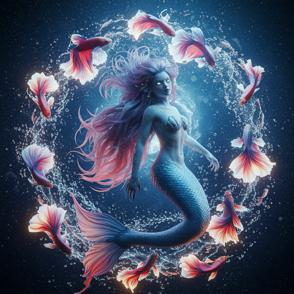 Enchanting vision of a cursed mermaid named Shelma, intertwined with swirls of luminous, vibrant fighting fish, set against an ethereal backdrop of dark azure and crystalline whites. The scene is illuminated by an otherworldly glow, capturing the essence of a solarpunk dreamscape. Set within a galaxy-spanning dimension, the composition is rendered in hyper-realistic detail, exploring the 5th dimension in a 32k UHD resolution masterpiece created through DAZ3D. This work retains an intricate dance of light and water, merging the mystical beauty of a mythical siren with the celestial wonders of a boundless universe.