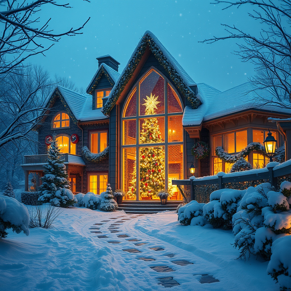 Enchanting winter wonderland scene featuring a luxurious, festive home adorned with shimmering Christmas lights and elegant decorations, nestled amidst softly falling snow; a majestic Christmas tree twinkles through a large window while a warm, inviting glow emanates from inside, creating a heartwarming, cinematic atmosphere in high-definition quality.