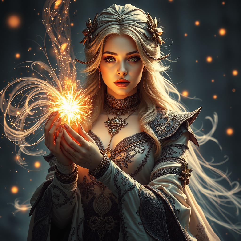 Enchanting woman clasping a mystical tome with shimmering ethereal trails and luminous particles swirling around her, adorned in elaborate fantasy garments, captured in exquisitely detailed fantasy art with dramatic, cinematic lighting and crisp focus, evoking a surreal, dreamlike atmosphere, rendered in ultra-high-definition 4k.