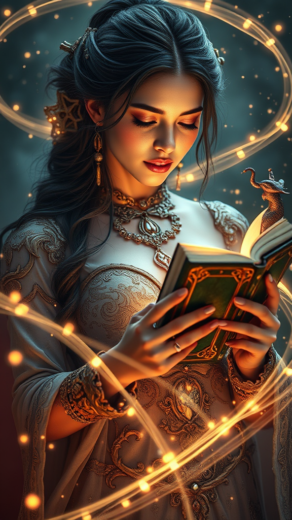 Enchanting woman clutching a mystical tome with luminous trails swirling around her, fine particles of light dancing in the air; she is adorned in intricate fantasy attire, depicted in highly detailed fantasy art with cinematic lighting; the scene is captured in sharp focus, appearing surreal and rendered in ultra-high-definition.