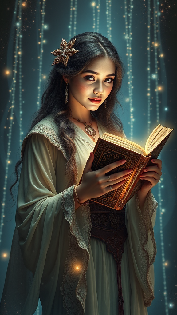 Enchanting woman clutching an ancient tome| ethereal luminous pathways| shimmering light particles| mystical garments| intricately detailed fantasy illustration| dramatic illumination| crisp clarity| surreal| digital artwork| ultra high-definition nfixer.