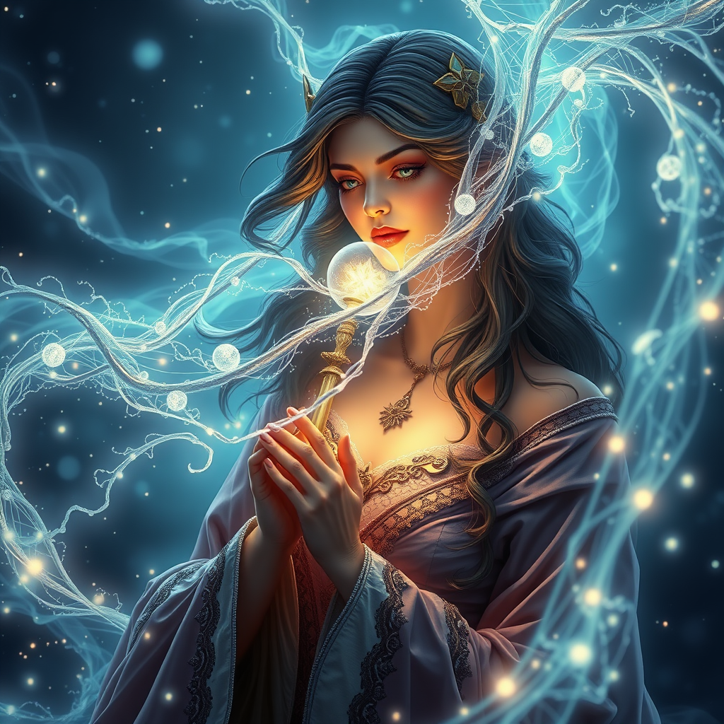 Enchanting woman with a mystical tome | ethereal glowing paths | luminescent dust particles | enchanted robes | intricately detailed fantasy illustration | dramatic lighting | crystal-clear focus | surreal | digital render | ultra high-definition visuals.