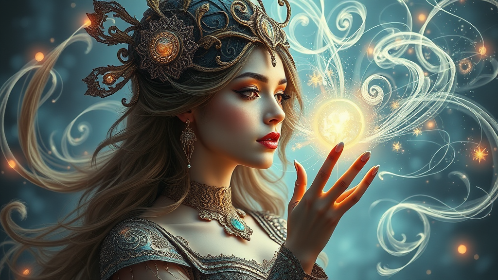 Enchanting woman with a mystical tome| luminous swirling trails| ethereal light particles| elaborate fantasy attire| intricate fantasy illustration| dramatic illumination| crystal-clear definition| surreal| digital artwork| ultra-high-definition