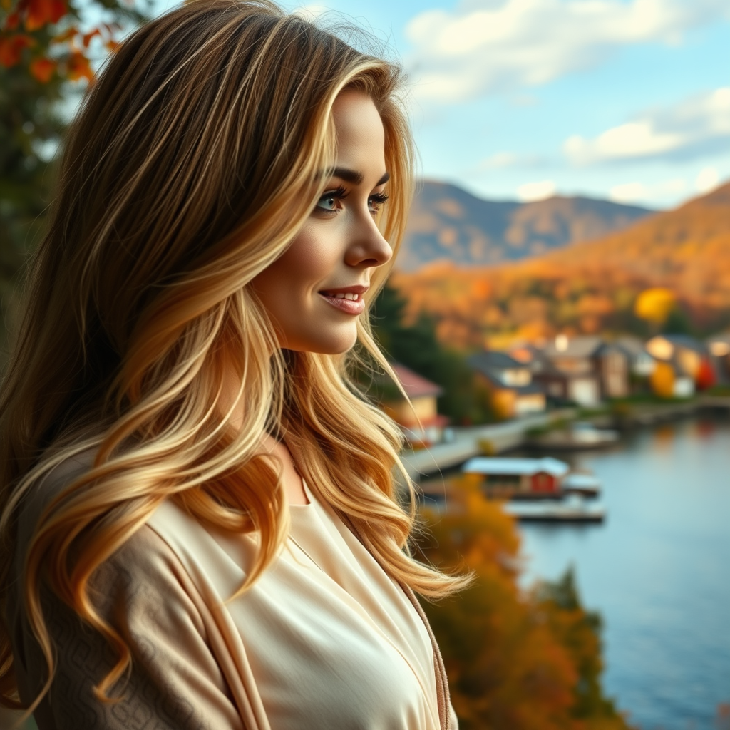 Enchanting woman with cascading golden hair, viewed in profile, gazes warmly at the viewer, adorned in an elegant blouse and chic jacket BREAK stunning panorama of charming houses lining a lakeside, vibrant fall hues painting the scenery. Acclaimed, professional, intricately detailed, compelling, harmonious, vibrant, clear, crisp, high quality, colorful.