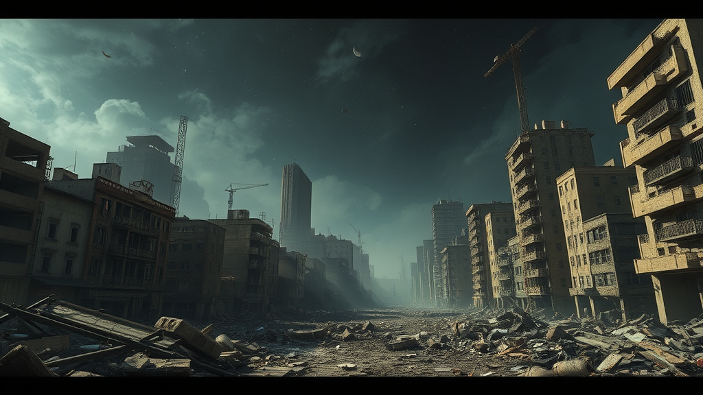 End of the world, epic and realistic apocalypse scene set in an abandoned cityscape, featuring neutral colors beneath a night sky. The shot is captured with a cinematic style focusing on screen space reflections, as showcased on ArtStation. The complex background is filled with partially destroyed buildings and debris. A subtle vignette enhances the mood, maintaining a sense of eeriness. Avoiding any poorly drawn elements or anatomical inaccuracies, the scene refrains from featuring extra limbs, floating parts, mutations, or any sign of disconnection, ensuring a coherent and immersive visual experience.