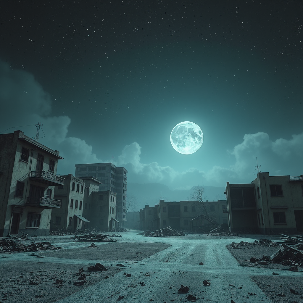 End of the world, epic realistic scene, depicting an apocalyptic setting, with abandoned buildings under a night sky. The scenario features neutral colors with screen space refractions hinting at a desolate yet eerily beautiful landscape. The shot is inspired by cinematic techniques found on art platforms like ArtStation, offering a vignette effect and a complex, immersive background. Buildings stand as silent witnesses to the passage of time, remaining intact and untarnished by artistic errors such as poor anatomy or mutated structures. The atmosphere is hauntingly serene, capturing the essence of a world left behind.