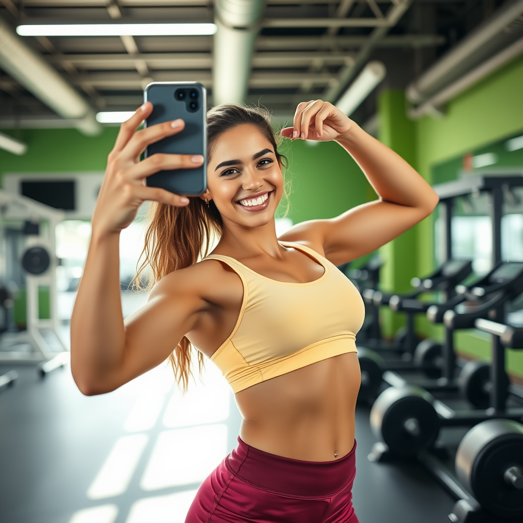 energetic young woman taking a selfie in a bright gym environment vibrantpositive fitnessenthusiast healthyglow dynamicpose avoiding prominent logos and text in the background showcasing confidence and empowerment