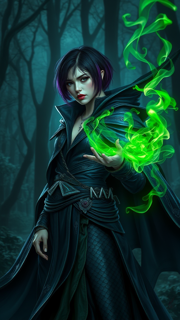 Enigmatic dark witch in an adventurer's attire, a voluminous cloak cascading around her, set against a mystical fantasy forest landscape. Her garments shimmer with dragon scales, and she wields mysterious fantasy magic. Her short, purple-black hair is stylishly trimmed to a fade, casting a stark contrast against the moody, dark light of the night. The scene is intricate and elegant, with clear focus and exceptional detail. A digital painting capturing concept art, enriched with swirling green neon smoke. The style is reminiscent of the works by VLOP, Artgerm, Greg Rutkowski, and Alphonse Mucha, culminating in a breathtaking masterpiece.