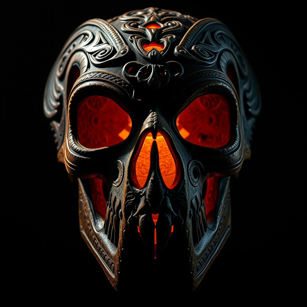 Enigmatic Maori-inspired carved skull, intricate detailing, cinematic lighting, atmospheric photography, cultural resonance, mysterious aura, dark contrasting shadows, ancient artistry