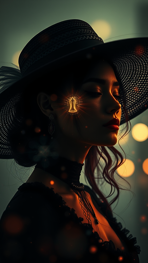 Enigmatic silhouette of a woman with a wide-brimmed hat, inspired by artists Minjae Lee, Carne Griffiths, Emily Kell, and others. Captured in an ethereal double exposure style, the scene is enriched with surreal geometric patterns, showcasing amazing depth. The depiction features intricately detailed elements with a touch of bokeh for a perfectly balanced composition. Smooth artistic photorealism weds with an unrealistic saturated palette, and high contrast highlights a slightly exaggerated large nose. This fusion of painting, drawing, and sketch blends cartoon, anime, and manga influences seamlessly into a CG render. The artwork avoids low quality traits such as watermarks, graininess, and blurriness, while delicately highlighting features like a long neck and closed eyes adorned with face jewelry, capturing a sense of mystery and allure.