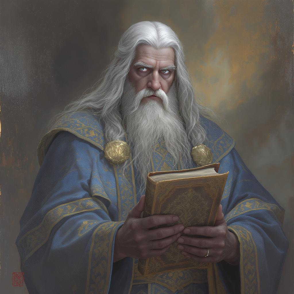 Enigmatic sorcerer portrait with flowing silver and grey hair, exuding a calm wisdom through serene, expressive eyes. The mature figure radiates kindness and magic, dressed in traditional, ornate garments. He holds a weathered, ancient tome, evoking a fantastical aura. The artwork is intricately detailed and elegant, blending fantasy elements with a multidimensional, spiritual essence. A digital painting in sharp focus, capturing the ethereal intricacies and harmonious elegance of the character.