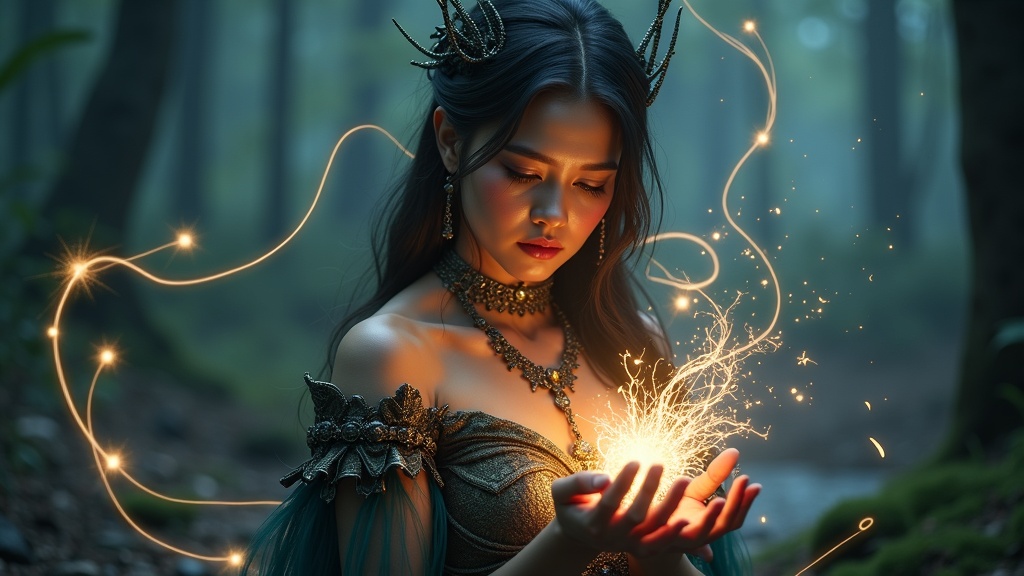 Enigmatic woman grasping an enchanted tome, surrounded by luminous trails and ethereal light particles, donned in intricate fantasy attire, showcasing highly detailed mystical art with dramatic lighting, sharp clarity, and an otherworldly atmosphere, cinematic render in 4k.
