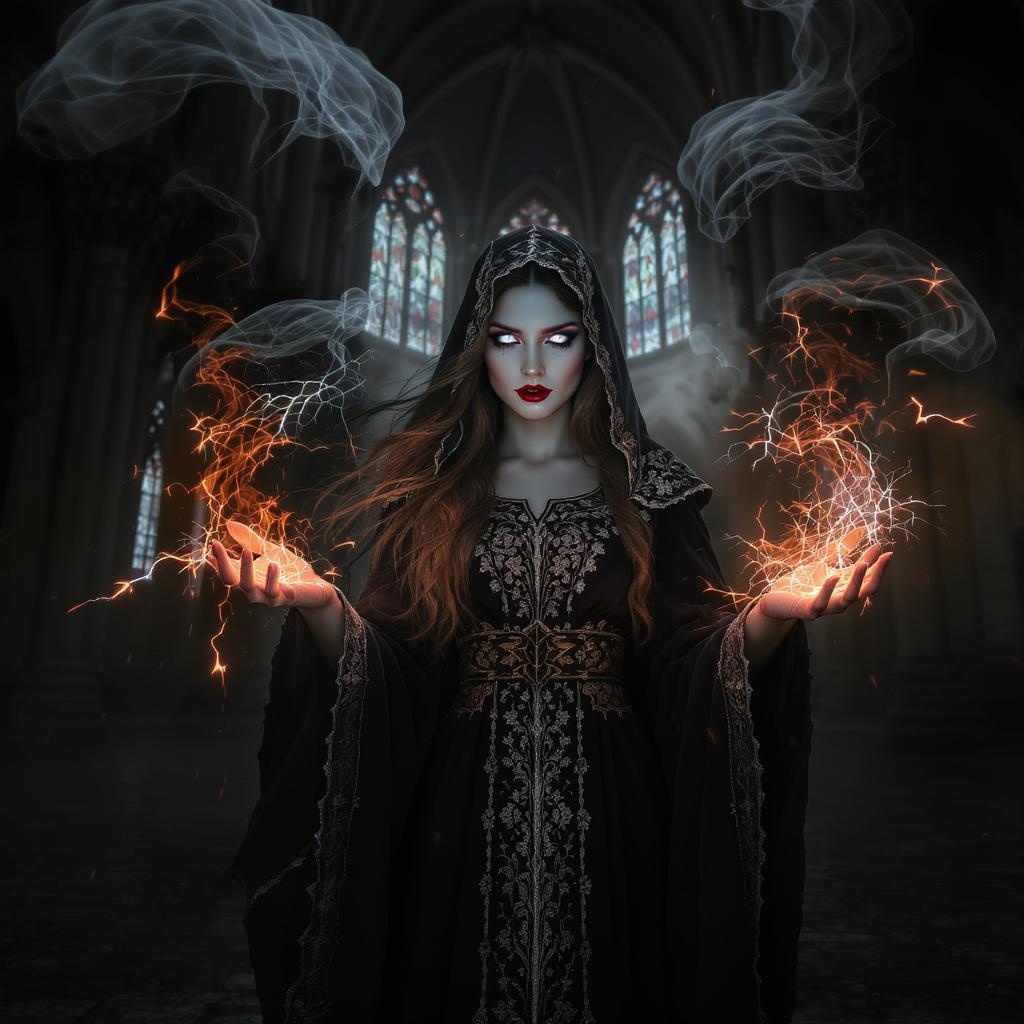 Enigmatic young woman steeped in dark fantasy, her striking presence commanding the shadowy expanse of a gothic cathedral. With a solemn gaze, she summons ethereal ghost lights that dance through the hallowed hall, casting an eerie glow. The atmosphere is thick with an unsettling sense of mystery as she conjures an ancient magic spell, her hands crackling with tendrils of electricity and blazing flames.