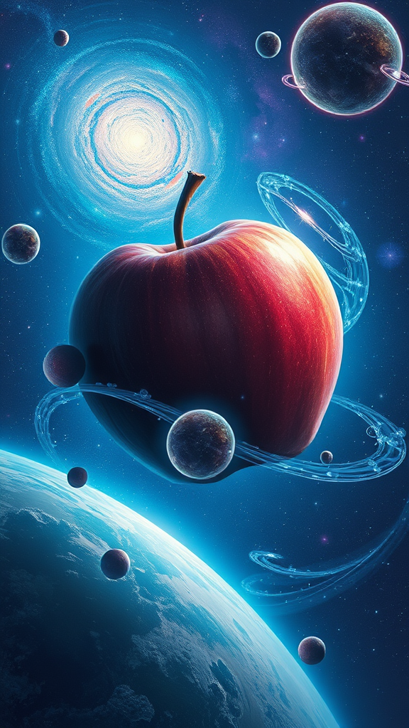 Enormous apple plummeting to the earth, encircled by swirling galaxies, vivid and surreal hues highlighting blues and purples, cosmic atmosphere with an ethereal and otherworldly vibe, abstract and dreamlike essence, fantastical collision of celestial and terrestrial realms.