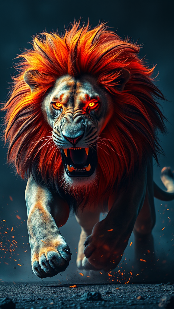 Enormous fluorescent lion charging with majestic beauty and raw power, exuding an aura of rage and divine presence, captured in an epic wide shot with dark fantasy elements, using cutting-edge CGI and depth-focused cinematography. The scene is shot on a Hasselblad H6D-400c Multi-shot with a Mitakon Speedmaster 300mm f/5, featuring a 6 XCD lens, enveloped in moody lighting, presenting a breathtaking blend of intensity and grandeur.
