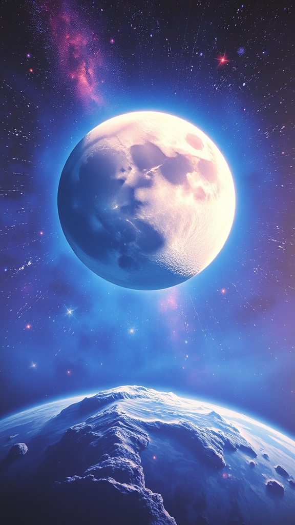 Enormous moon descending towards the earth with distant galaxies in the backdrop, radiating vibrant and surreal hues focusing on blues and purples, creating a cosmic and otherworldly atmosphere in an abstract and dreamlike style, merging celestial grandeur with imaginative artistry.