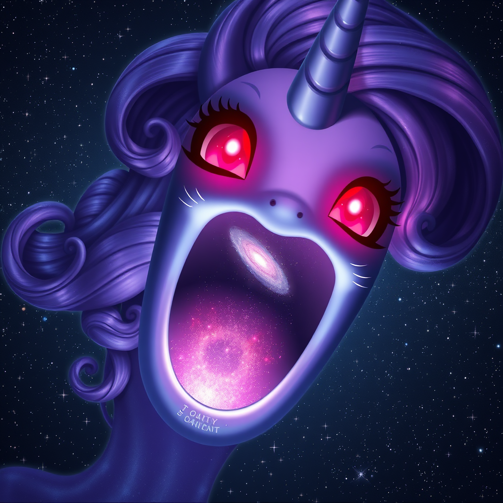 Enormous Twilight Sparkle, larger than a galaxy, floats majestically in the depths of space, her eyes glowing with an intense red luminescence. A tiny galaxy hovers delicately in front of her looming, open mouth. In an extreme, zoomed-in perspective, the scene captures the intricate details of her swirling, cosmic mane and shimmering, ethereal fur. Her mouth forms a mesmerizing vortex, drawing in the galaxy as if it's a pearl of light, creating a stunning display of contrasting scales. The endless stars around her highlight the spectacle of this surreal, photo-realistic cosmic encounter.