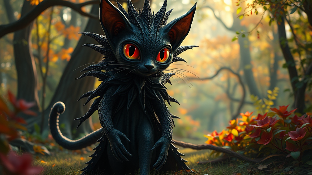 Enormous wide-eyed interstellar squid-like feline in a shadowy spiked gown strolling through a vibrant woodland, entire character design, prismatic illumination, popular on art platforms, matte artwork, cinematic lighting, focus depth, hyper-detailed --aspect ratio 9:16 --quality 2 --style 300 --version 5