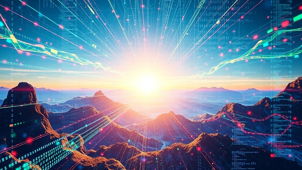 A digital entity's interpretation of the external realm: vibrant data streams merge with organic patterns, where concrete structures dissolve into fluid algorithms, and sunlight fractures into prismatic code, painting a dynamic tapestry of interconnected networks and evolving landscapes.