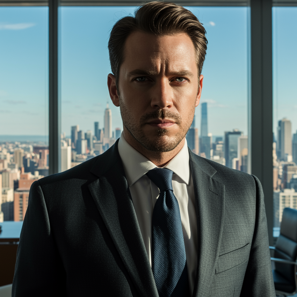 A powerful entrepreneur with a striking resemblance to Ironman stands in a sunlit, high-rise office, the dramatic play of light casting bold shadows across his face. His gaze is intense and focused, embodying a blend of visionary confidence and calculated determination. The sleek, modern décor of the office reflects both luxury and cutting-edge technology, emphasizing his dual nature as a businessman and an innovator. His tailored suit fits impeccably, but there's a subtle nod to his superhero alter ego in the form of a metallic, arc-reactor-inspired tie pin. The cityscape stretches beyond the floor-to-ceiling windows, a testament to his empire and ambition, while his presence commands the room with an aura of sophisticated power and relentless drive.