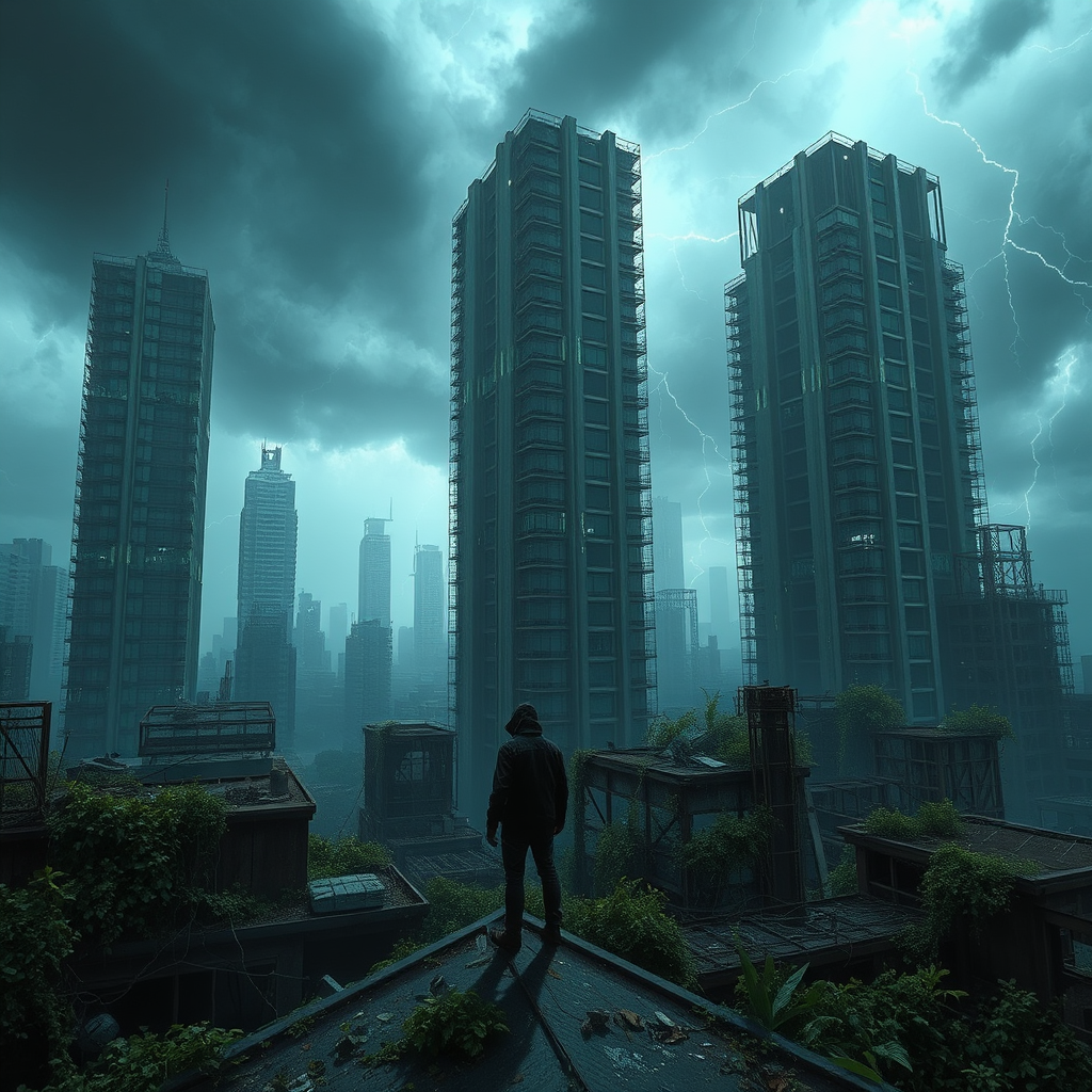 Envision a breathtaking dystopian landscape where towering, crumbling skyscrapers loom under a perpetually stormy sky, their glass facades shattered and glinting in the dim light. Overgrown vegetation reclaims the concrete jungle, weaving through rusted structures and abandoned vehicles. A solitary figure stands on a rooftop, gazing out at the chaotic urban expanse, cloaked in shadows and illuminated by sporadic flashes of lightning. The scene is both epic and hauntingly quiet, capturing a world on the brink of rebirth from ruin.