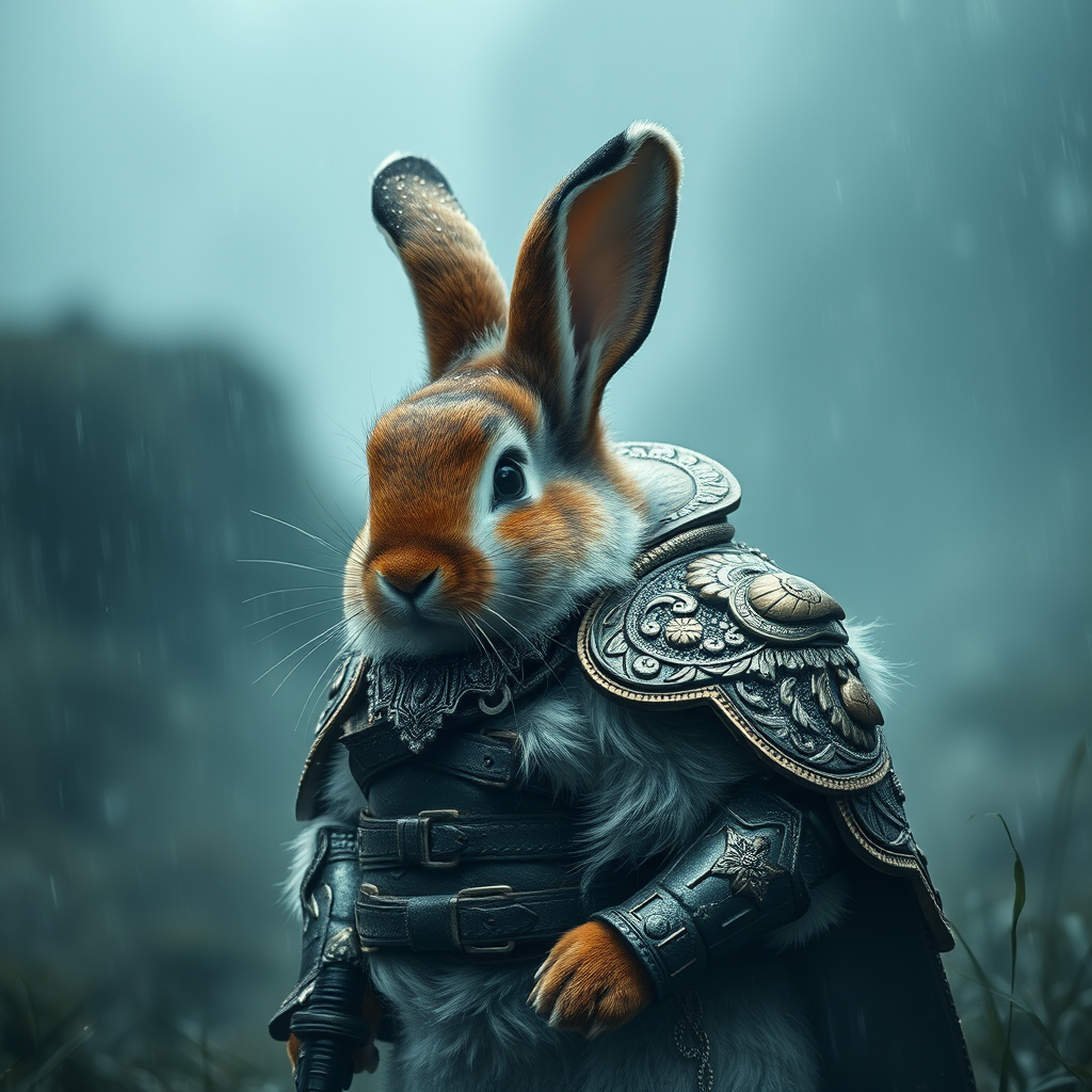 Envision a bunny clad in intricately ornamented light armor, its fluffy fur glistening with droplets in a foggy, rain-soaked landscape. The scene is set amidst a brewing storm, captured with a cinematic 70mm lens that highlights every detail with extraordinary clarity. The atmosphere brims with intensity and drama, conjuring a world both mystical and fierce. The visual storytelling evokes an epic narrative, despite a faint whisper of imperfection lingering at the edges, reminding one of the beautiful yet unpredictable nature of the wild.